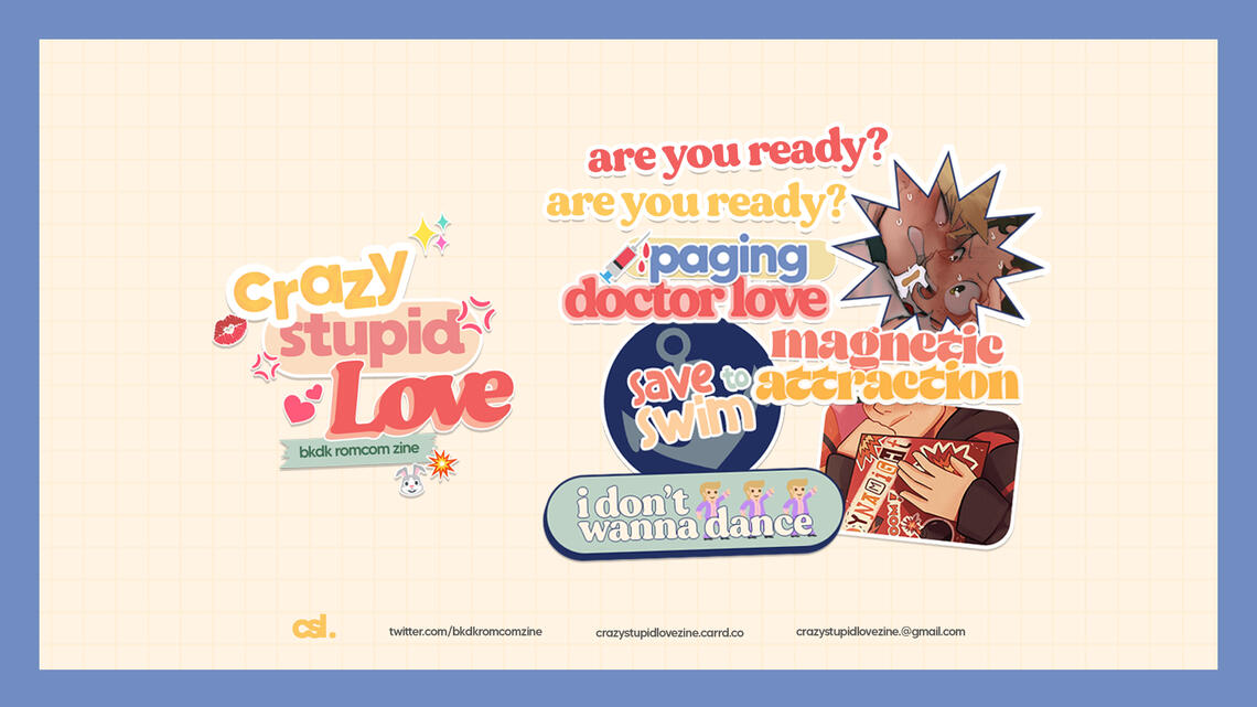 CRAZY STUPID LOVE is a SFW BKDKBK, for-profit Zine that centers around Bakugou Katsuki and Midoriya Izuku. It explores their kind of crazy, kind of stupid relationship and how it all comes together in love.The Zine is set to have applications both for moderators and contributors.